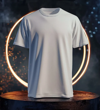 This is a plain white t-shirt with a relaxed fit, featuring short sleeves and a round neckline. The background includes glowing circular lighting, adding a sleek and modern aesthetic. The fabric appears smooth and lightweight, suitable for casual wear.